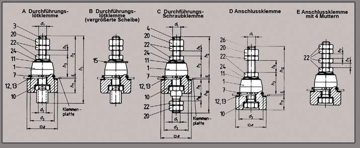 Ausführungsart, Abmessungen und Werkstoffe der Bolzenanschlussklemmen entsprechen den Vorschriften der Normblätter DIN 46260 und DIN 46262.